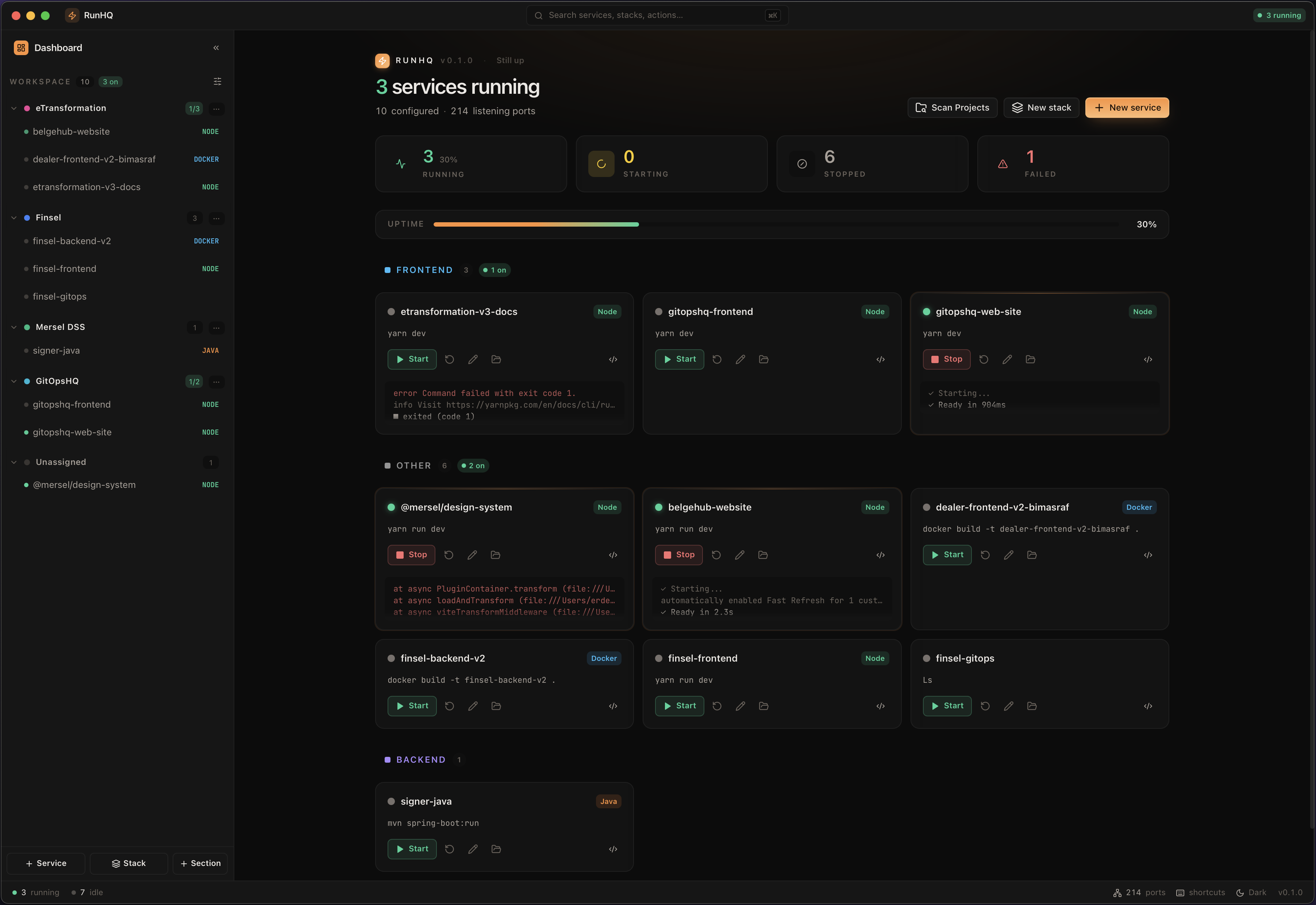 Dozens of projects. Hundreds of services. One native app to start, stop, tail logs and watch ports — no containers, no cloud, no account.